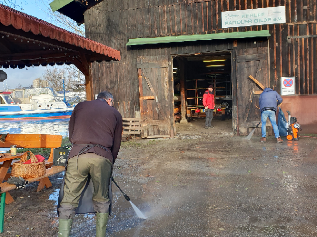 Die Hauptaktion aber – von Manuela vorbereitet und von Andreas geleitet – war das große Entrümpeln. Unglaublich was sich mit den Jahren im Bootshaus angesammelt hat: Mehrere defekte Stühle, drei (!) Einkaufswagen, diverse Stangen, Kartons und vieles mehr. Manche Gegenstände waren – gefühlt – hundert Jahre alt. Dabei ist die KPG erst 95!