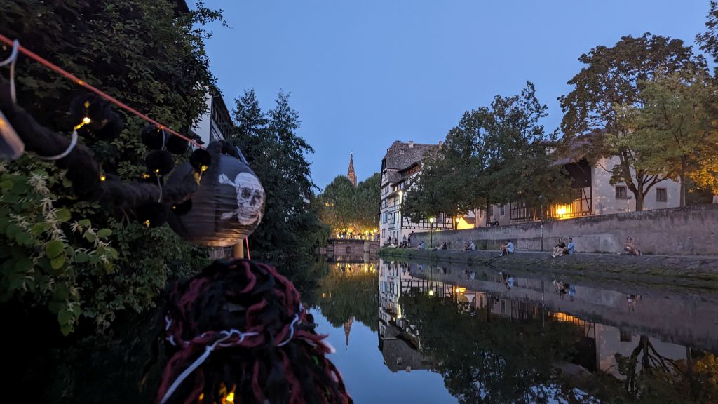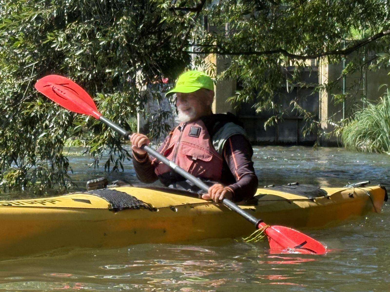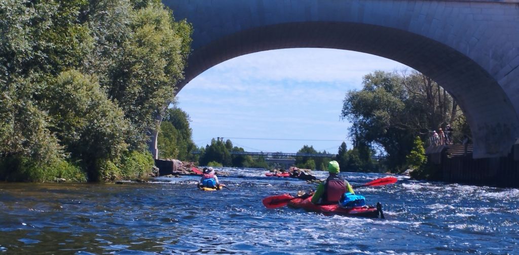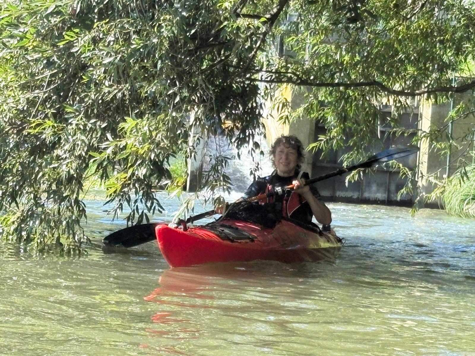 Nach einer Übernachtung vor Ort und einem ausgiebigen Frühstück stieg jede*r wieder in das Kajak, das am Vorabend am Steg des Clubs abgestellt worden war. Die Abenteuer begannen kurz nach dem Club mit einer ersten Wasserrutsche, deren Wellen uns alle durchnässten. Die Wirbel der zweiten Rutsche brachten eine französische Paddlerin zum Kentern. Bei der dritten Rutsche fuhren wir unter dem Astbogen einer Weide hindurch.